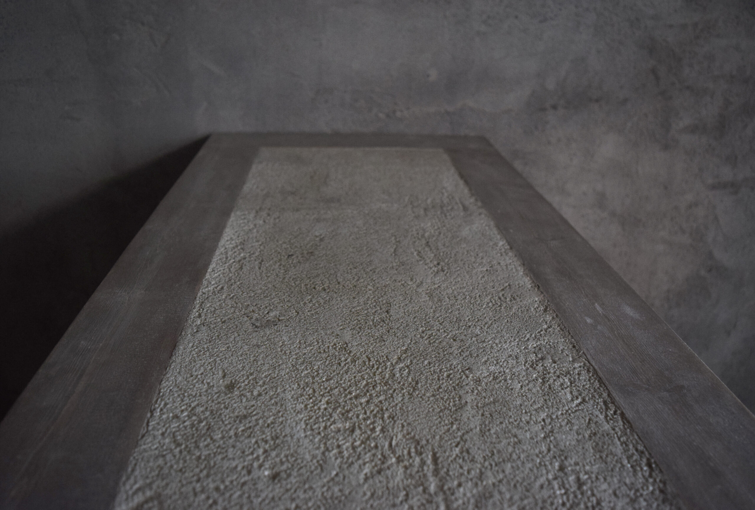 古材の板を横目に貼り付け、より長めすっきりとした印象のキッチンカウンター。天板は木枠にモルタルを流し込みあえてややザラつきのある仕上げで程よい手触り感を残す。あたかも幾年もの間、何代も受け継がれてきたような風合いを醸し出す。